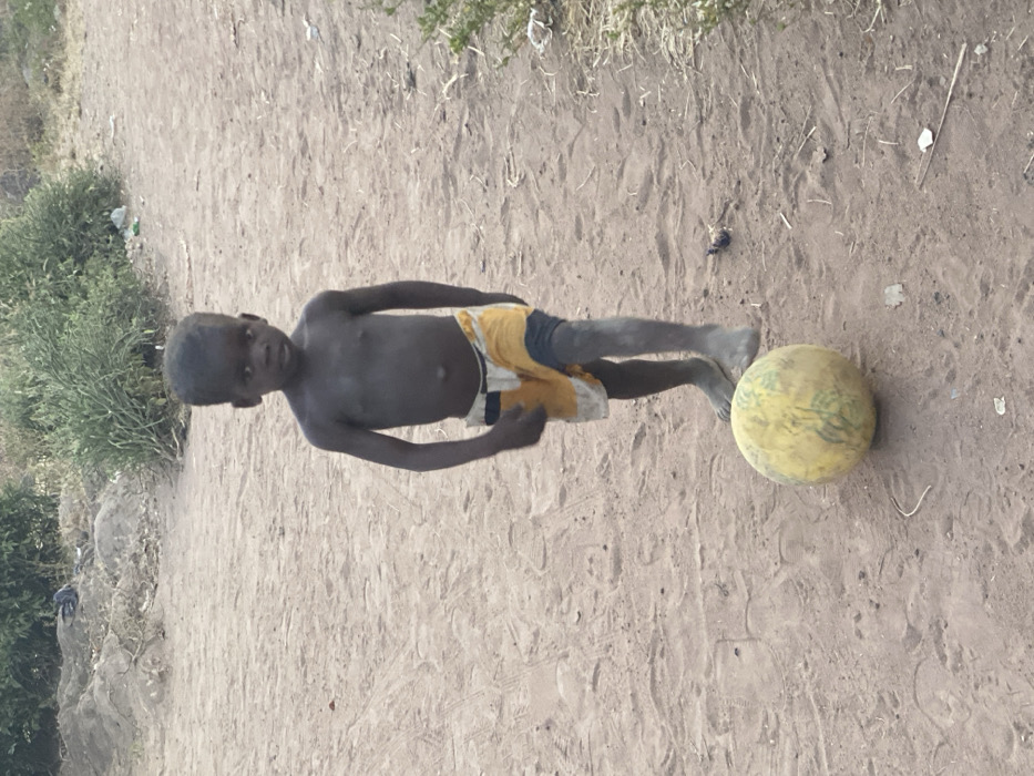 A shirtless young boy stands on a dirt surface next to a round, faded yellow object resembling a soccer ball