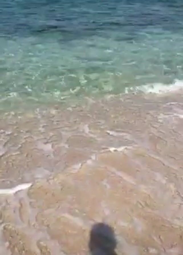 view of a beach on a sunny day. The water is clear and turquoise near the shore, gradually darkening to a deeper blue further out. Small waves are washing onto the sandy beach, creating white foam. In the distance, there's a red buoy and what appear to be sailboats or yachts. The shadow of the person holding the camera is visible in the foreground on the sand.