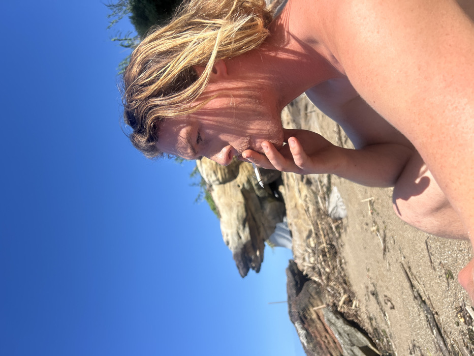 A fair-skinned male, positioned in profile facing right, is depicted on a sandy beach. He possesses long, wavy blonde hair and a light mustache. He is shirtless, revealing a tanned complexion, with vertical shadows from an unseen source falling across his face and neck. The male holds a white cigarette between his right index finger and thumb, with the cigarette positioned at his mouth as if actively smoking. The foreground consists of light brown sand interspersed with small debris. In the midground and background, large, weathered light-colored rock formations are visible, one featuring a distinct, eroded shape. Sparse green vegetation grows on and behind these rocks. The sky above is clear and bright blue. The scene is illuminated by strong natural sunlight, casting distinct shadows. The described location is Coalcliff, Australia.