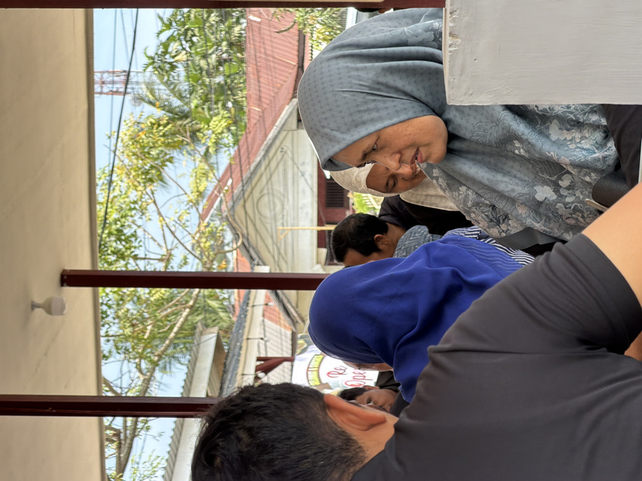 A group of people are gathered under a covered area, likely outside. A woman in a blue hijab and an older woman in a patterned gray hijab are prominent in the view. Other individuals are partially visible in the background, including a man with dark hair in a black shirt and another woman in a white headscarf. The setting appears to be a casual gathering or event. Trees, buildings, and a clear sky are visible in the background.