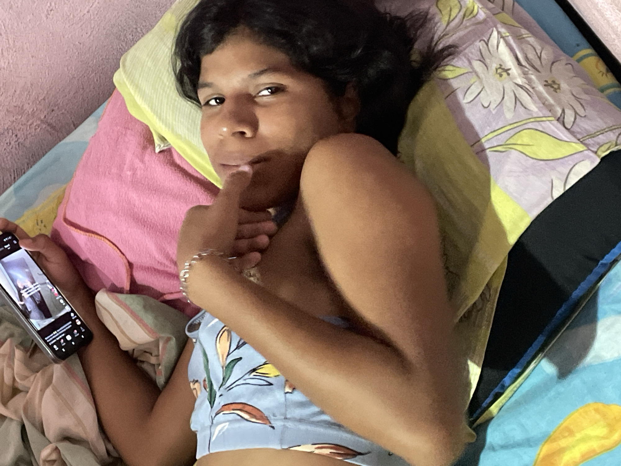 A young woman is lying on a bed, propped up by pillows. She holds a smartphone in her left hand, and her right hand is near her mouth with her index finger touching her lips. She is wearing a blue floral-patterned top. The bed has multiple pillows with different patterns and colors, including pink, yellow, and floral designs. The bed is covered with patterned sheets. The image was captured indoors. Specific information about the location in Macho Muerto, Venezuela, is not discernible from the image.