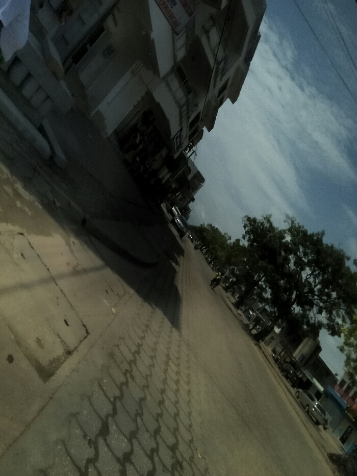 The image displays a diagonally oriented street scene in Cotonou, Benin, captured under a blue sky with scattered white clouds. On the left side, a series of multi-story buildings line the road, some with commercial facades; a sign partially visible on one building reads "MARCHE." The immediate foreground on the left features a concrete sidewalk, transitioning to a patterned section of interlocking pavers further down the street. The main road is asphalt, with multiple long shadows extending across it, suggesting a low sun angle. Vehicular presence includes several parked cars along the right side and at least one motorcycle with a visible rider actively moving in the mid-ground. Dense-foliaged trees line the right side of the thoroughfare. A partial view of a person's upper left arm or shoulder is visible in the extreme top-left corner of the frame.