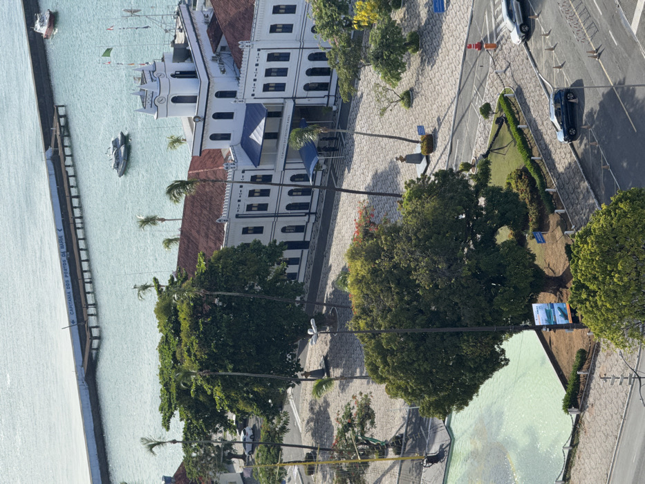 An aerial shot reveals a cityscape where the waterfront meets urban life. A large, white building with a red roof stands prominently next to a pier and boats. A street with cars runs alongside the building, separated by trees. The scene is sunlit, casting shadows on the ground and water.