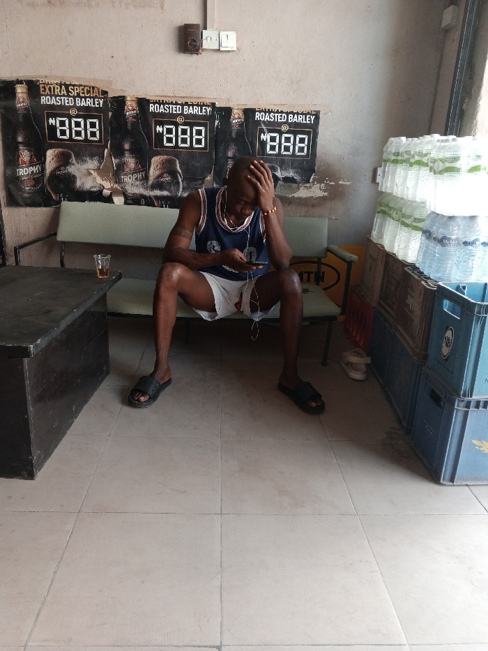 An indoor scene in Sabon Gari West, Nigeria, depicts a dark-skinned male adult seated on a light green bench. He is wearing a dark blue sleeveless jersey with white trim, white shorts, and dark-colored slides. His right hand is positioned on his head/forehead, while his left hand holds and operates a dark smartphone. White wired earbuds are visible, connected to the phone and worn by the individual. A light-colored beaded bracelet adorns his right wrist. To the left of the man, a dark, rectangular wooden table holds a clear plastic cup containing a light brown liquid. Behind the man, a light-colored, worn wall displays four identical, faded posters advertising "EXTRA SPECIAL ROASTED BARLEY" from the "TROPHY" brand, each priced at "N888". Above these posters, two brown electrical boxes and two white electrical switches are mounted on the wall. To the right of the man, against the wall, multiple stacks of plastic bottled water are piled on top of at least two blue plastic crates, with a third partial crate visible at the bottom. The floor is covered with light-colored square ceramic tiles.