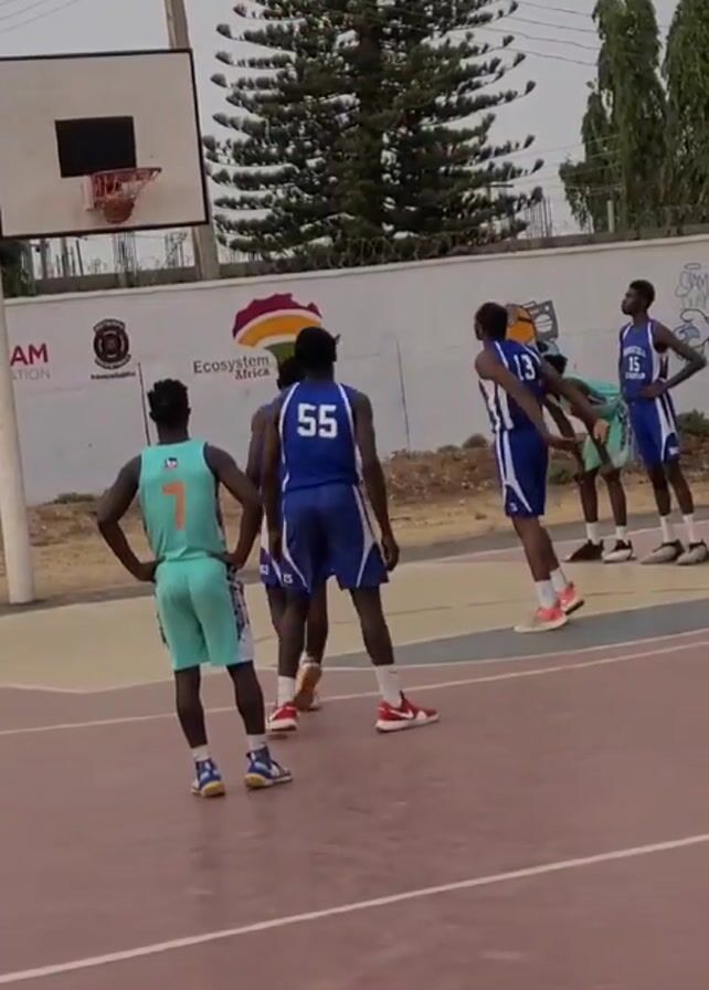 group of basketball players on an outdoor court. One player in a blue jersey (#13) jumps to shoot a basketball towards the hoop. Other players in blue and teal jerseys watch the shot. A large pine tree stands in the background, behind a wall with branding for "Ecosystem Africa". The court has maroon and white lines. The sky is overcast.