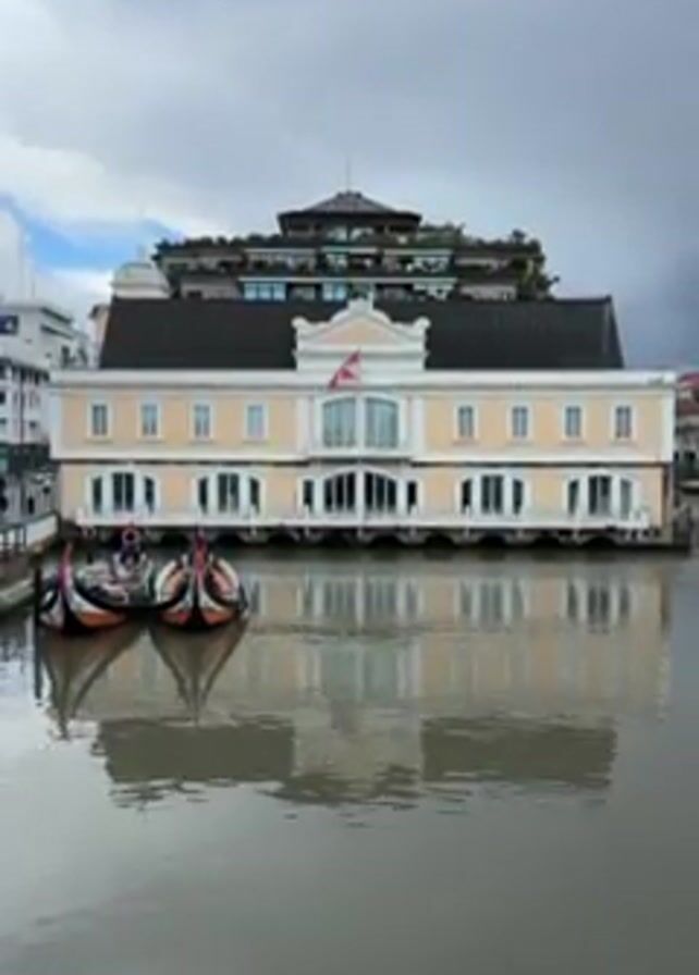The scene shows a body of water with three boats docked along a building with a light yellow facade. The building reflects in the water, and the sky is overcast. Above the main building is a structure with a dark roof and multiple levels, topped with greenery. Other buildings are visible in the background, though less prominently. No people are clearly visible.