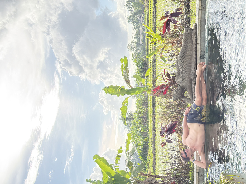 - "The image depicts an outdoor scene in Mas, Indonesia, featuring an adult male relaxing in a swimming pool against a backdrop of rice paddies" by FM-ytW0x1, licensed under CC BY 4.0