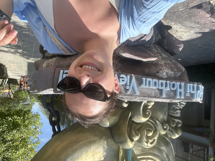 A young woman with light skin, dark hair, and wearing black cat-eye sunglasses, a white bikini top, and a light blue open shirt, smiles directly at the camera while taking a selfie. She is positioned in front of a large, multi-component sign. The upper portion of the sign features a golden-toned, abstract, wave-like sculpture. Below this, a base constructed from rock-like material displays light blue dimensional letters spelling "Phi Harbour Vie". To the right of the woman, a paved pedestrian walkway extends into the distance, bordered by green trees and trimmed hedges. Several other individuals are visible walking along this path in the background, including one wearing an orange top. Buildings are discernible behind the sign on the left. The scene is brightly illuminated by daylight under a clear sky, indicating an outdoor setting at Phi Harbour View, Unknown, Unknown.