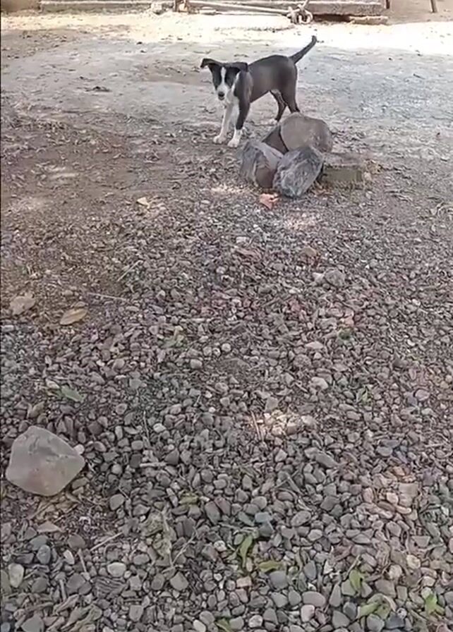 small, playful puppy in a yard. The puppy is predominantly dark gray with white markings on its face and paws. It appears excited and approaches the person holding the camera, jumping up and down playfully. The person briefly pets the puppy. The background is a yard covered in small gray rocks. There's a concrete structure visible in the background, along with some tools and a ladder.