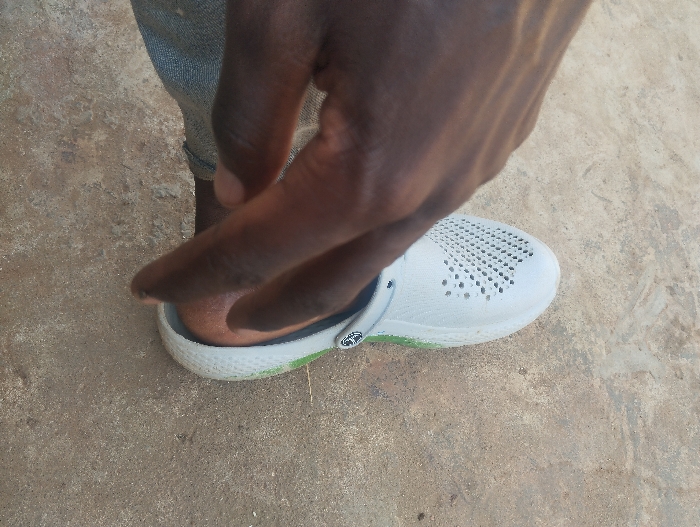 In the city of Idon, Nigeria, a close-up overhead shot captures a dark-skinned individual interacting with an object. The right foot of the individual, partially clad in light blue or faded denim trousers, is inserted into a light gray, closed-toe sandal with numerous hexagonal ventilation holes on its upper surface. The sandal features a green accent along its sole and shows signs of dirt. An ovoid object, appearing to be a light brown egg or similar item, is positioned between the individual's right heel and the rear portion of the sandal. The individual's right hand, also dark-skinned, is positioned above the sandal and the ovoid object, with fingers pressing down on the object. The immediate environment consists of a rough, light brown or tan ground surface, consistent with concrete or packed earth, showing minor irregularities and dirt.