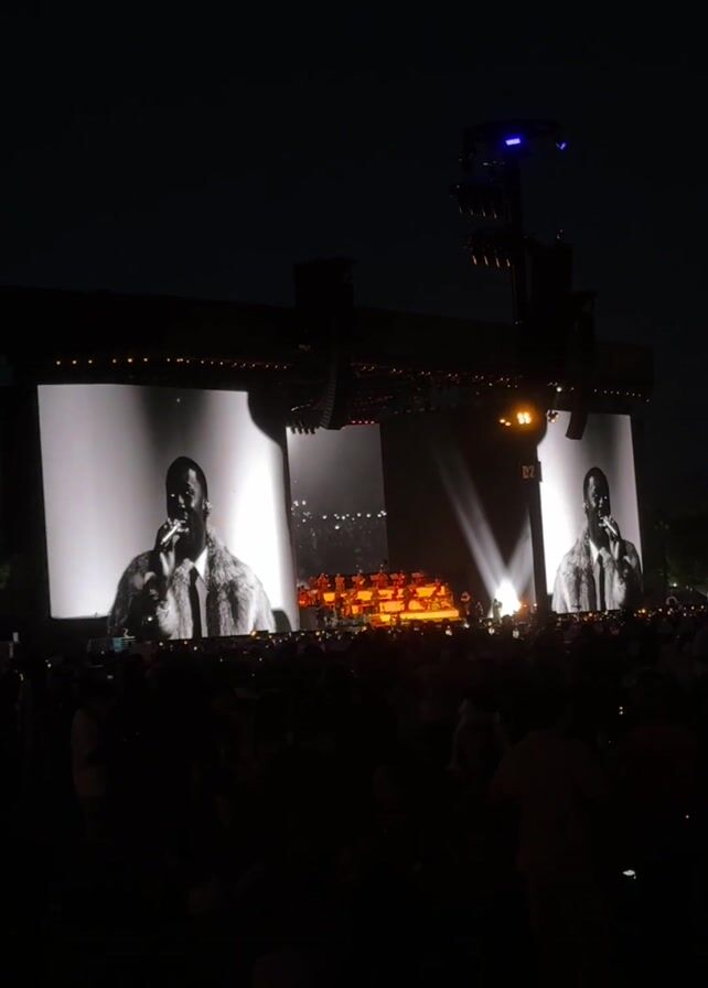 A dark, shaky, wide shot shows a crowd of people facing a concert stage. On either side of the stage is a large, flat screen with a black-and-white image of a man wearing a fuzzy jacket and tie, holding a microphone. The man on the screen is the apparent performer. In the center of the stage is a raised platform with other performers, illuminated by orange lights. A tower with a blue light is visible above the stage. The crowd is mostly silhouetted against the bright stage lights. There is some movement and activity in the crowd, suggesting they are enjoying the performance.