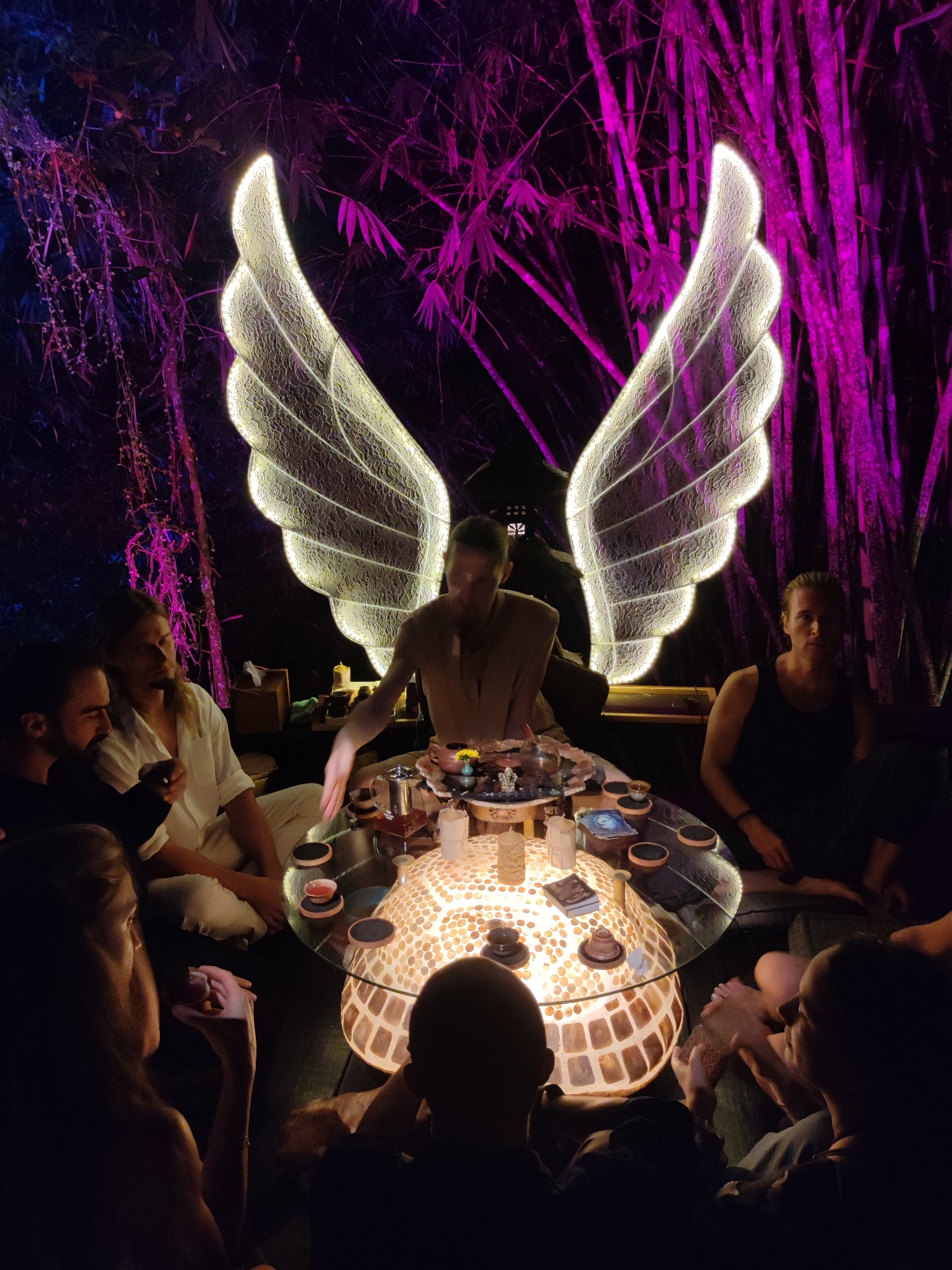The image captures a group of people sitting around a lit table, potentially sharing a tea ceremony. The scene takes place outdoors at night. People: Around 8-10 people are sitting or kneeling around a circular table. There is one individual at the head of the table, potentially leading the ceremony. They're wearing a light-colored top. Other individuals are dressed in dark or light clothing. Their expressions are not distinct due to the low light but appear relaxed. Subjects: The central subject is the gathering around the table. A pair of large, glowing angel wings are positioned behind the person at the head of the table. Objects: A round, glass-topped table sits in the center of the group. Underneath the glass is a decorative, illuminated base. The table holds various tea-related items, including a teapot, cups, saucers, and small containers. Tarot cards and candles are also visible on the table. Behind the group is a backdrop of bamboo stalks, some lit with purple light. Actions: The person at the head of the table seems to be pouring or preparing tea. Other individuals are sitting, some holding small cups. They appear to be engaged in conversation or listening. Interactions: There is a sense of community and connection among the people. The actions suggest a deliberate and mindful sharing of tea. Environment: The scene is set outdoors at night, likely in a garden or natural setting due to the bamboo backdrop. The location is Blahbatuh, Indonesia, according to the prompt. The lighting is dim but accentuated by the glow of the table and the wings. The purple-lit bamboo adds a whimsical element to the environment.