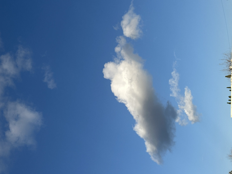 The image displays an upward-angled view of a bright blue sky over Beit Yitshak Sha'ar Hefer, Israel, under daytime lighting conditions. The upper two-thirds of the frame are dominated by the clear blue expanse. Several cumulus clouds are present: a prominent, elongated cloud mass with a white top and a darker gray underside extends across the mid-section, from the left of center towards the right. Smaller, whiter cumulus clouds are scattered in the upper-left, upper-right, and below the main cloud mass. The bottom fifth of the image reveals elements of a distant horizon. A horizontal segment of a light-colored building or wall is visible, topped by a line of several slender, dark green conical trees. To the right of these trees, bare deciduous tree branches are evident. No individuals, animals, or explicit actions are discernible within the frame.