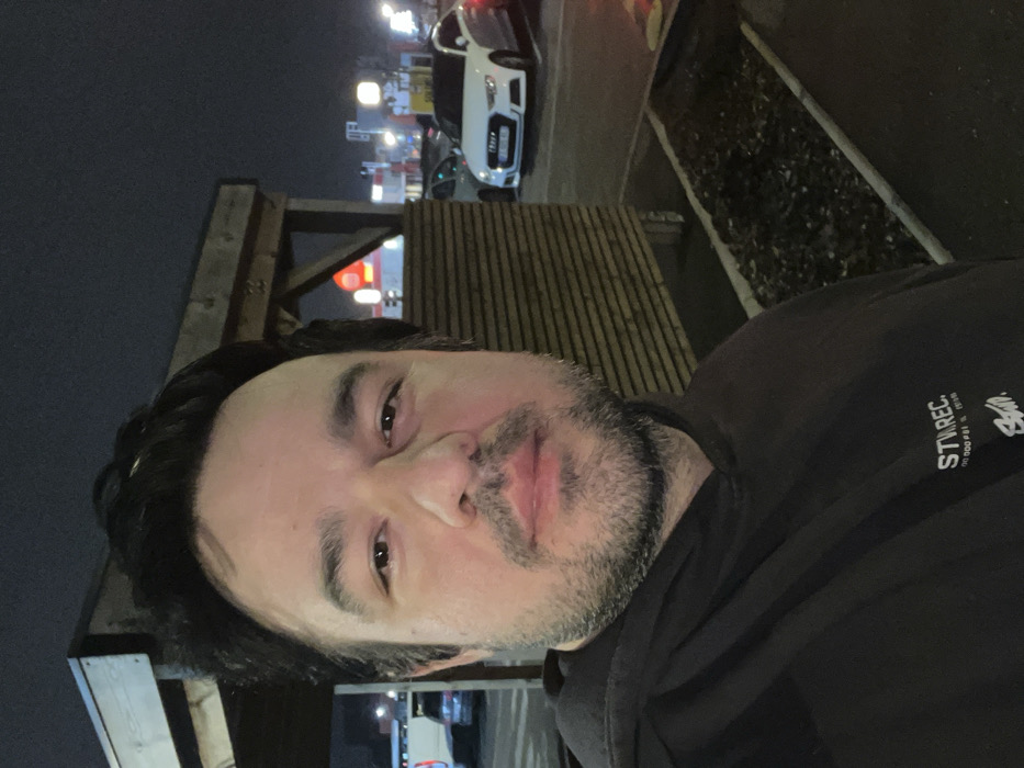 A man in a black hoodie poses for a selfie at night. Street lights and parked cars illuminate the background. A wooden structure is to the left, adjacent to a narrow strip of gravel. The man has dark hair and a beard. The hoodie has "STW.REC." printed on it. The image is rotated.