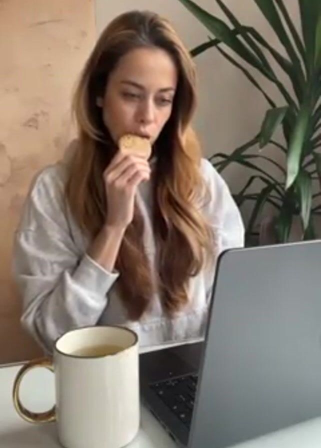 A woman with long brown hair, wearing a gray hoodie, is sitting at a white desk in front of a gray laptop. She is eating a round cookie and looking at the laptop screen. To the left of the laptop is a white mug with a gold handle. Behind her is a painted wall and a large green potted plant. There is a drop of liquid on the desk.