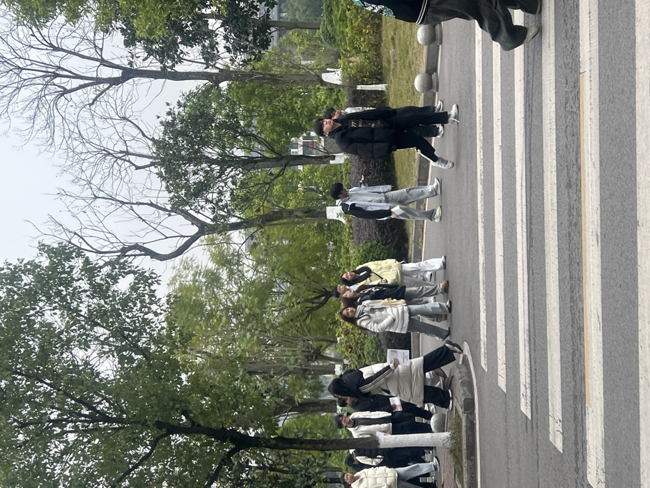 A group of people are crossing a zebra crossing. They are all dressed in casual clothing, and some are wearing jackets. Trees line the left side of the road, while the right side has pavement and grass. The sky is overcast. The individuals are walking in a line across the street. The image has been rotated 90 degrees counter-clockwise.