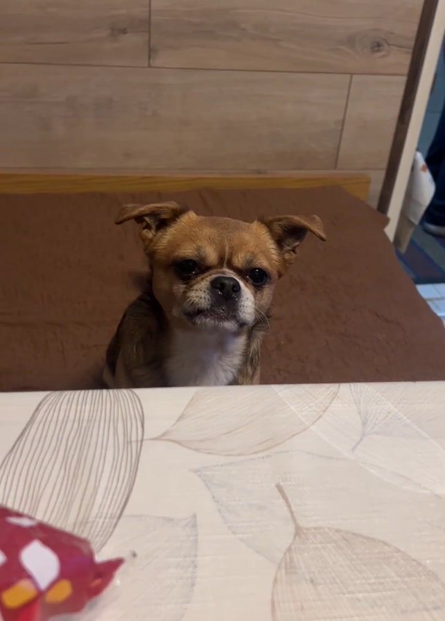 A brown and white chihuahua mix sits on a bed, facing forward. A printed tablecloth is in the foreground and a wood paneled headboard is in the background. The dog has small white spots on its muzzle. The dog looks intently at the camera.