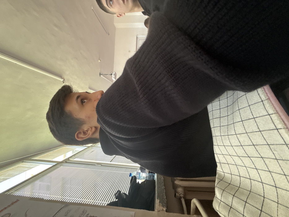 The image captures an indoor scene within a classroom or lecture hall in Kozloduy, Bulgaria. In the left foreground, a young male with short, dark hair is seated, facing right in profile. He is wearing a dark, ribbed turtleneck sweater, and his gaze is directed upwards and to the right. A light-colored fabric with a dark grid pattern, possibly a notebook cover, rests on a surface in front of him. To his left, a long window fitted with horizontal blinds runs along the wall, with a concrete or painted sill below it. On this sill, a dark object (potentially a bag) and a clear plastic water bottle are visible. A radiator is partially visible beneath the window sill. In the mid-ground to the right, a second young male with short, dark hair is partially visible, also looking towards the right with a slightly open mouth. The room features light-colored walls, a white ceiling with fluorescent tube lighting, and a white ceiling-mounted projector in the background. Both visible individuals appear to be focused on an area outside the right side of the frame.
