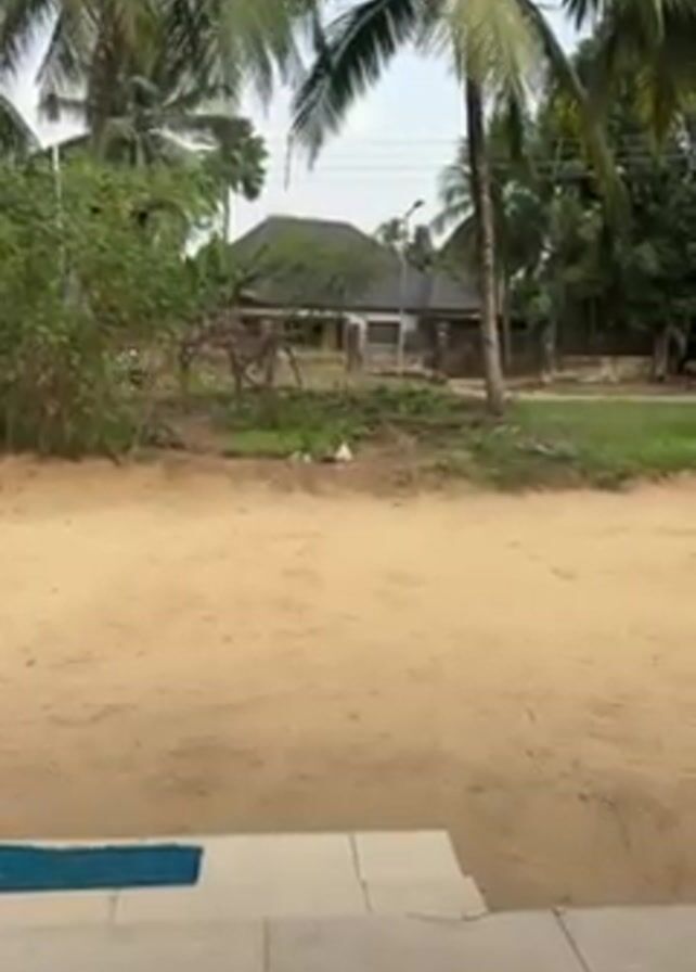 The video presents a stationary perspective of a tropical outdoor scene, shot from a slightly elevated position, likely from the steps of a building or porch