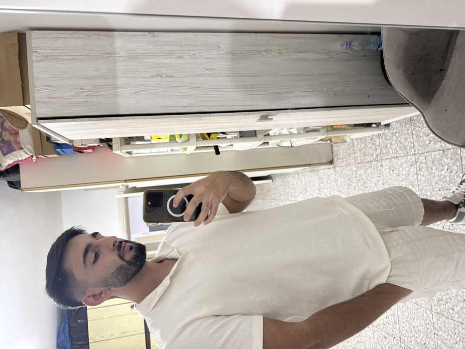 A young adult male, appearing in his 20s with dark hair, a fade haircut, and a trimmed beard, is depicted indoors in Tel Aviv, Israel, taking a mirror selfie. He is wearing a white short-sleeved collared shirt and white textured shorts, with his left hand in his pocket. He holds a dark-colored smartphone with a visible MagSafe accessory ring in his right hand, angled towards the mirror. The background, visible through the mirror's reflection, reveals a room with light-colored walls and a speckled grey and white tiled floor. To the subject's left (right in the reflection) is a light-toned wooden wardrobe or cabinet with a wood grain pattern. Above the wardrobe are various stored items, including cardboard boxes and a pillow with an image. Adjacent to the wardrobe is a multi-tiered white plastic shelving unit holding assorted objects, some brightly colored. A clear plastic water bottle rests on the floor next to the wardrobe. A grey upholstered chair or stool is partially visible in the lower right foreground of the reflection. A light-colored door is visible further in the background reflection.
