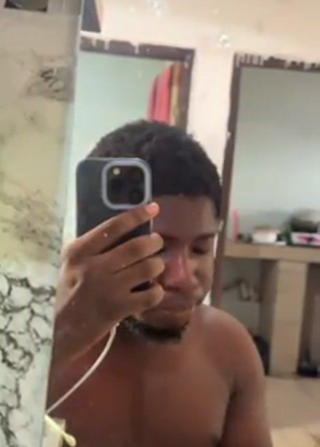 A shirtless man takes a selfie in a bathroom mirror while eating spaghetti. The man has dark skin, short, dark, curly hair and a short, dark beard. He holds a dark-colored smartphone with a visible triple-lens camera. White earbuds are connected to the phone. He brings a forkful of yellow spaghetti up to his mouth and eats. Behind him in the mirror, there is a cluttered counter and tiled walls. The mirror itself has a mottled appearance.