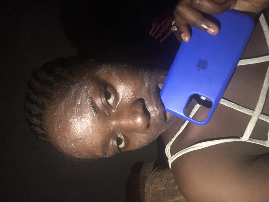 A dark-skinned person holds a blue iPhone case. The person has braided hair and fair skin. Straps of a top with a white crisscross pattern are visible. The background is dark.