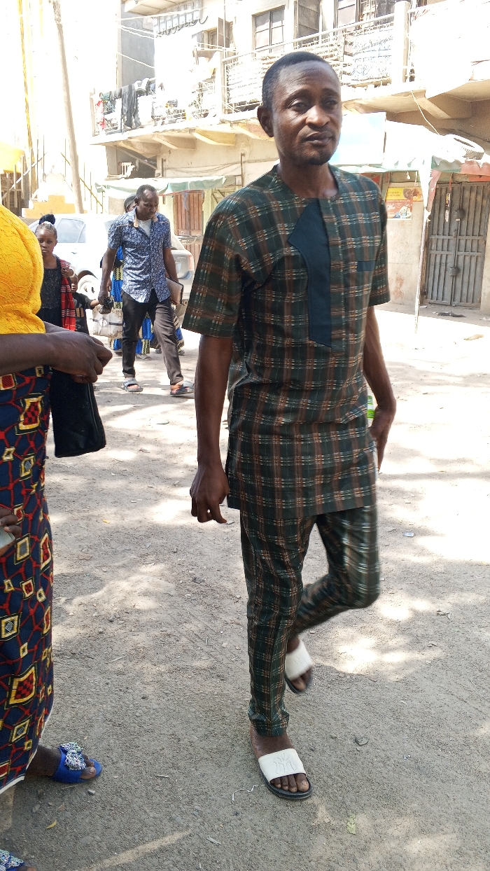 This image depicts a daytime street scene in Sabon Gari East, Nigeria. In the immediate foreground, a dark-skinned adult male, estimated to be in his 30s or 40s, is positioned slightly right of center, looking directly at the camera. He wears a short-sleeved, two-piece plaid outfit in green, brown, and black, featuring a solid dark blue panel on the chest of the top. His feet are clad in white slip-on sandals with black soles; his left foot is flat on the ground, and his right foot is slightly lifted, indicating motion. To the left of this individual, a second person, partially visible, wears a yellow top and a blue skirt with red and yellow geometric patterns, along with a blue sandal on the left foot; their left hand holds a small black pouch. In the midground, further to the left, a third dark-skinned adult male walks away from the viewer, glancing left. He wears a blue patterned short-sleeved shirt, dark trousers, and multi-colored sandals. A fourth, younger individual with dark hair, wearing a dark top and a red and black patterned cloth draped over the shoulders, is visible behind him. A white vehicle is partially obscured in the midground, left. The ground consists of light-colored dirt or gravel, with scattered debris and shadows indicative of bright overhead sunlight. The background features multi-story buildings, appearing to be residential or mixed-use, constructed of light-colored concrete or plaster. Clothes are visible hanging on a balcony or railing of one building. Several ground-level entrances have metal security gates or shutters. Makeshift awnings, possibly for small businesses, extend from some structures.