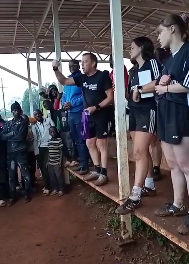 group of people standing under a corrugated metal roof structure. A man in a black t-shirt and shorts is addressing a crowd of people. He is gesturing with his right hand while holding a purple item in his left hand. To his right, two women in black Adidas athletic wear stand and listen. The crowd is mixed in age and attire. The ground is red dirt. The structure appears to be a makeshift shelter overlooking a field.