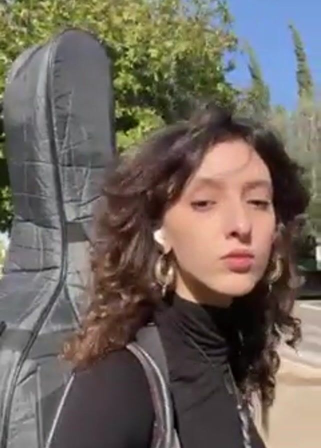 A young woman walks along a paved road on a sunny day, with her dark brown hair blowing in the wind. She wears a black turtleneck top, a silver necklace, and small, intricate earrings. She carries a black guitar case on her back and a studded leather bag on her shoulder. In her right ear, she has an AirPod. The background includes green trees, parked cars, a white pole, and a clear blue sky. The camera tracks alongside her, maintaining a close-up view of her face.