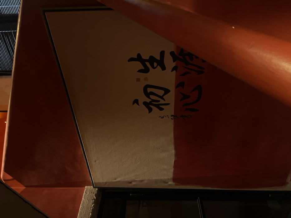 A partially obscured sign with Japanese calligraphy is mounted on an angular red structure. The sign is divided vertically, with a beige left side displaying black characters and a red right side with additional black calligraphy. The red structure appears to be part of a building's exterior, possibly a temple or traditional building. A dark window or doorway is visible below the sign.