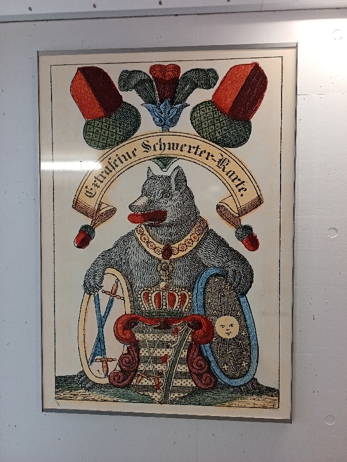 A framed, hand-colored illustration is centrally mounted on a white, possibly wooden, surface with three visible silver fasteners along the top edge, in a location within Altenburg, Germany. The print, titled "Extrafeine Schwerter-Karte" in German on a curved banner above the main subject, depicts a standing, anthropomorphic gray wolf-like creature with a protruding red tongue. The wolf wears a golden and red jeweled collar. Its right paw holds a circular shield adorned with crossed blue swords and two small red objects, while its left paw secures an oval shield featuring a stylized human-like sun or moon face with radiating lines and stars on a dark, patterned background. A red crown rests upon a large heraldic shield positioned below the wolf's torso, displaying geometric patterns and small red heart-like symbols. Above the banner, two red and green acorn-like motifs flank a central blue and red feathered plume. The entire illustration is contained within a thin black border and an off-white mat, protected by glass within a light gray frame.