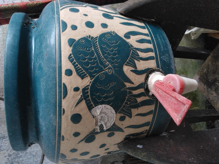 - "A teal and cream ceramic water dispenser is depicted, positioned on a dark, possibly metallic stand against a light-colored, textured wall in Phouviang-Gnai, Laos" by FM-oHfK92, licensed under CC BY 4.0