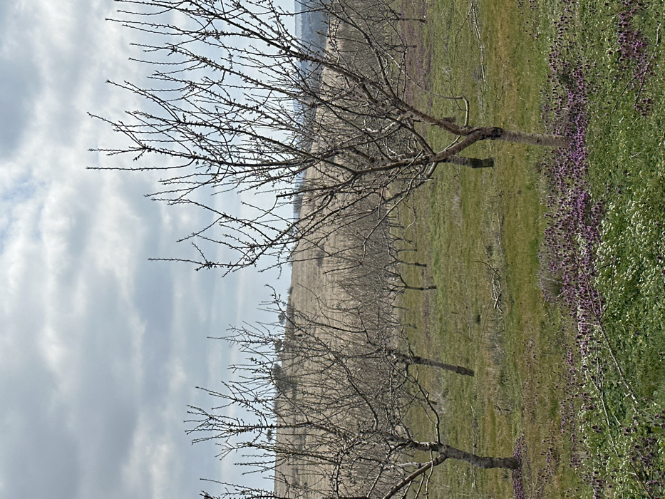 The image depicts an outdoor scene in an orchard located in Studena, Bulgaria, under an overcast sky. The foreground and mid-ground feature numerous bare deciduous trees, systematically arranged in rows, with slender, light-colored trunks and intricate, leafless branches characteristic of a dormant or early spring state. The ground beneath the trees is covered with a mix of green grass and extensive patches of small, vibrant purple flowers, interspersed with some white flowers and lighter green vegetation. In the background, a gently rolling hill with sparse, dry, light brown vegetation rises, partially obscured by the trees. The sky is entirely covered with light grey, stratiform clouds, indicating an overcast condition with diffused lighting. No people or animals are visible, and no discernible actions or interactions are occurring.