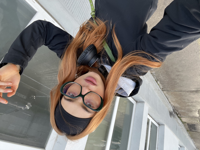 An individual is depicted in a close-up, upward-angled selfie, positioned outdoors in Pantin, France. The subject is a young adult female with long, wavy, reddish-blonde hair, a black fabric headband, and large, dark green, thick-rimmed oval eyeglasses. She wears a black jacket over a light grey hooded sweatshirt, with black over-ear headphones resting around her neck and a green strap visible across her chest. Her left hand (viewer's right) is raised, fingers slightly splayed, possibly indicating the hand holding the camera. The background on the left shows a concrete sidewalk adjacent to a white building with multiple white-framed windows and a grey lower facade. The background on the right features reflective building windows, revealing a distorted reflection of a dark-colored vehicle, likely a car, and partial reflections of a street or parking area. The scene is illuminated by natural daylight.