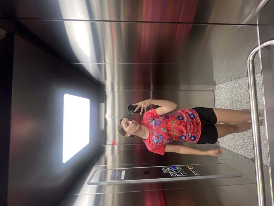 In an elevator, a woman stands sideways, facing the camera. She wears a red, patterned short-sleeved shirt and black shorts. Holding a phone, she appears to be taking a selfie. The elevator features metallic walls, a bright light panel, a control panel with buttons, and a handrail. The floor is speckled, and the reflection in the metallic walls adds depth.