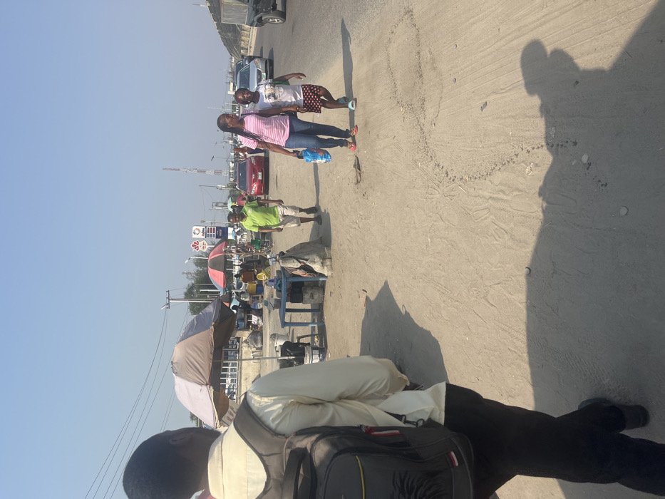 The image depicts a daytime street scene in Ikota, Nigeria, characterized by both informal commercial activity and pedestrian movement alongside a paved road