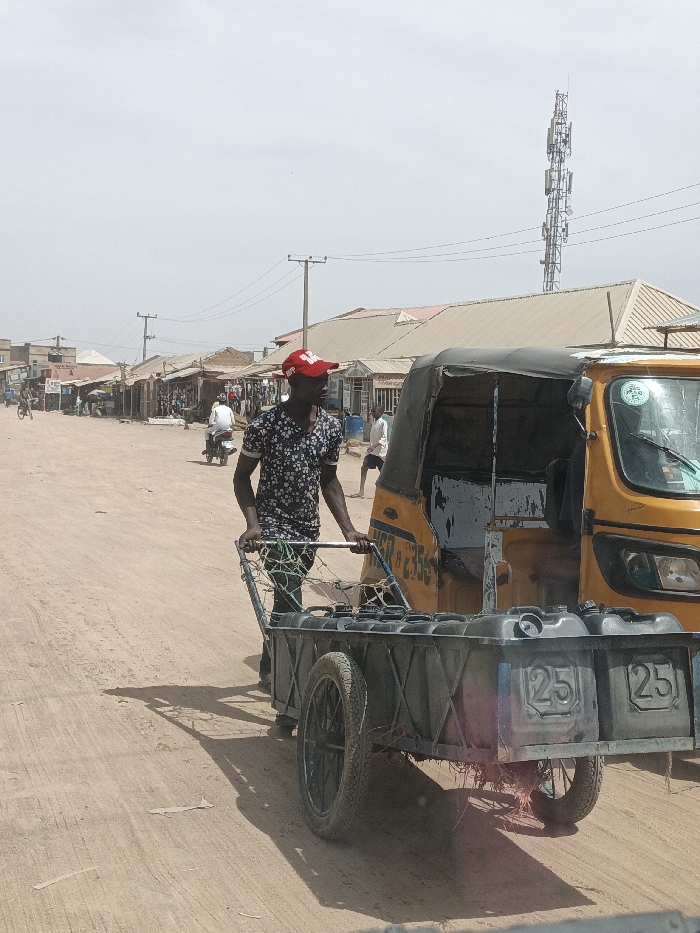The scene depicts an unpaved street in Hotoro South, Nigeria, under a bright, hazy sky. In the foreground, a male individual, appearing adult, wears a patterned dark short-sleeved shirt and a red baseball cap, pushing a dark-colored two-wheeled handcart. The handcart contains multiple dark plastic jerry cans, some visibly embossed with the number "25." To the right of the man and partially obscuring him, a yellow three-wheeled auto-rickshaw with a dark canopy is present. Its side displays partial alphanumeric markings including "RGR 2355." The street itself is dirt or sand, showing tracks. Along the left side of the street and receding into the background is a row of single-story buildings or market stalls, many with corrugated metal roofs. Utility poles with power lines are visible along the street. In the mid-ground on the left, another person rides a white motorcycle. A tall, metal communications tower with multiple antennae is prominent in the far background on the right side of the image. Shadows are cast distinctly on the dusty ground.