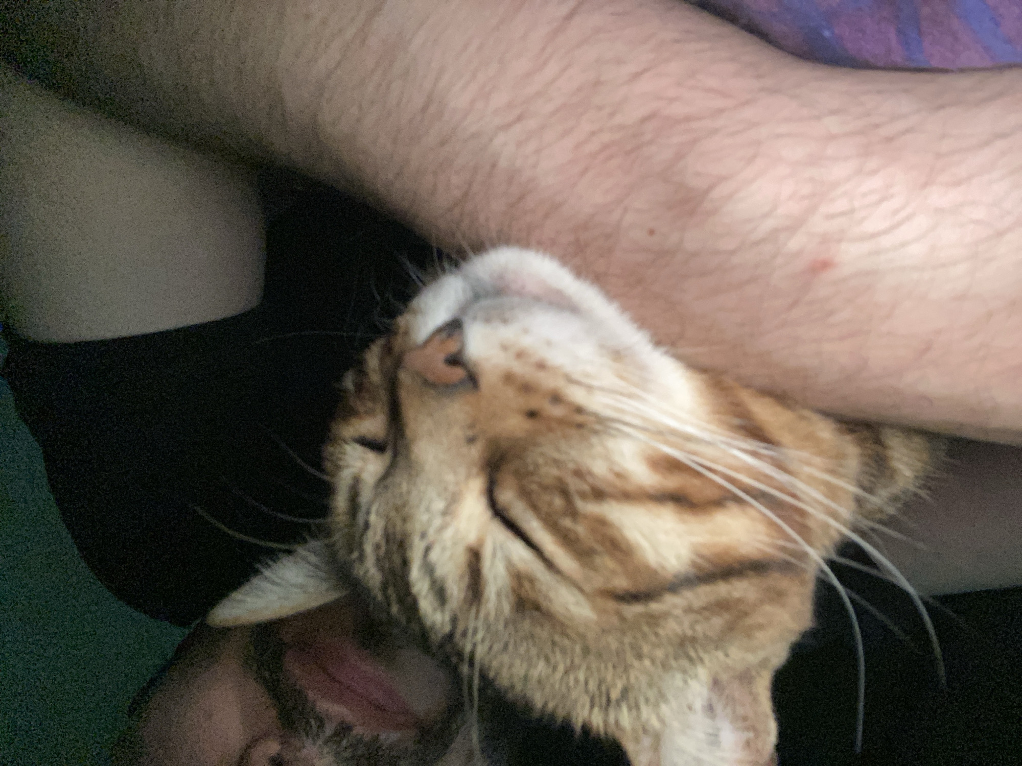 close-up of a person holding an orange tabby cat. The cat is resting with its head tilted upwards, nestled against the person's arm and chest. A portion of the person's face (chin and mouth) is visible at the bottom of the frame. The person's arm is hairy. The lighting is dim. The exact location within the city of Chaikovsky, Russia is not discernible from the image.