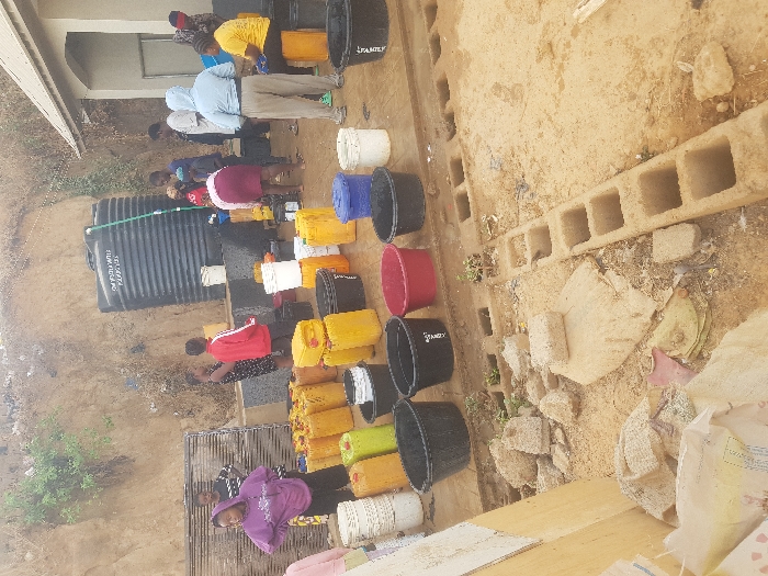 A scene of people filling assorted containers, mostly yellow jerrycans and black buckets, from a large black water tank. Several individuals are actively filling the containers, while others stand nearby. The scene is dusty, with stacked cement blocks and scattered debris in the foreground. Some containers line the side of the tank. The overall setting appears to be a rural or underdeveloped area with limited access to water.