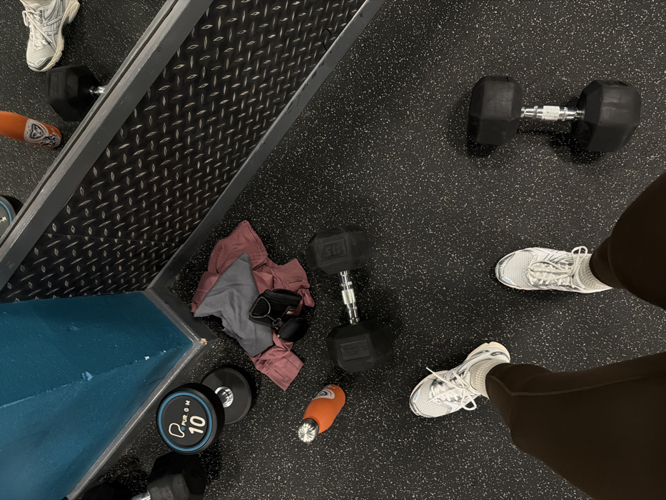 A gym floor displays fitness equipment. Two dumbbells, one appearing heavier, sit near white athletic shoes and brown leggings. A water bottle and smaller weights surround a pile of clothes and weightlifting gloves. The floor is black rubber, speckled with white, and a metallic weight rack extends along the left.