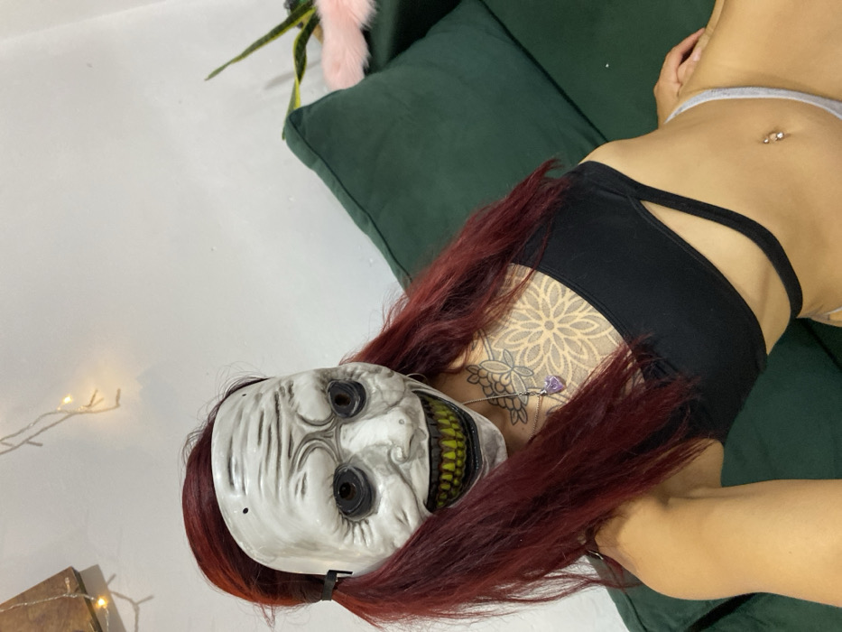 A person with red hair lies on a green couch, wearing a white mask with black eyes and a green, grinning mouth. The person is wearing a black top that exposes a large tattoo on their chest. They also wear light gray bottoms. A pierced navel is visible. The background is a white wall with string lights. A plant with a pink, furry accessory is visible on the couch.