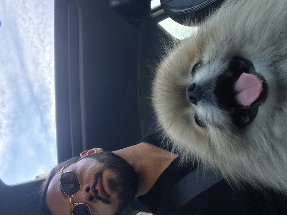 The image depicts a male individual and a Pomeranian-type dog inside a vehicle