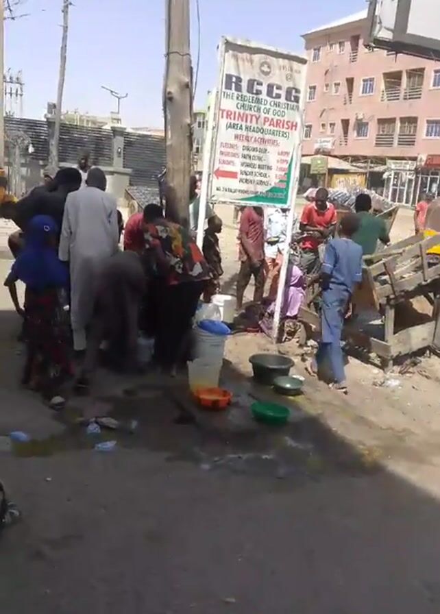 group of people gathered around a water source on a street. The people are diverse in age and dress. Some are using buckets and bowls to collect water. There are plastic bags and other trash scattered around the area. A sign for "RCCG Trinity Parish" is visible in the background. A yellow tricycle drives by.