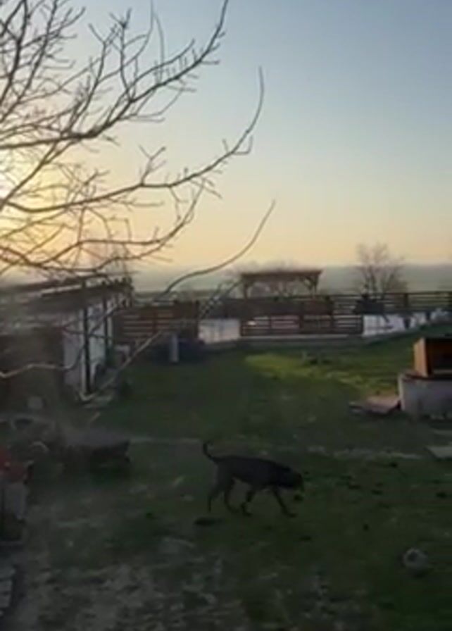 rural scene at sunset. A large, dark dog walks across a grassy yard, with buildings and fences in the background. There is a glimpse of a distant landscape. The camera then quickly pans up to show a house with a red tiled roof, and flags waving on top. Finally, the camera is pointed downwards to show a young woman in a light-colored hoodie and black leggings, leaning over a rooftop and making a face at the camera.