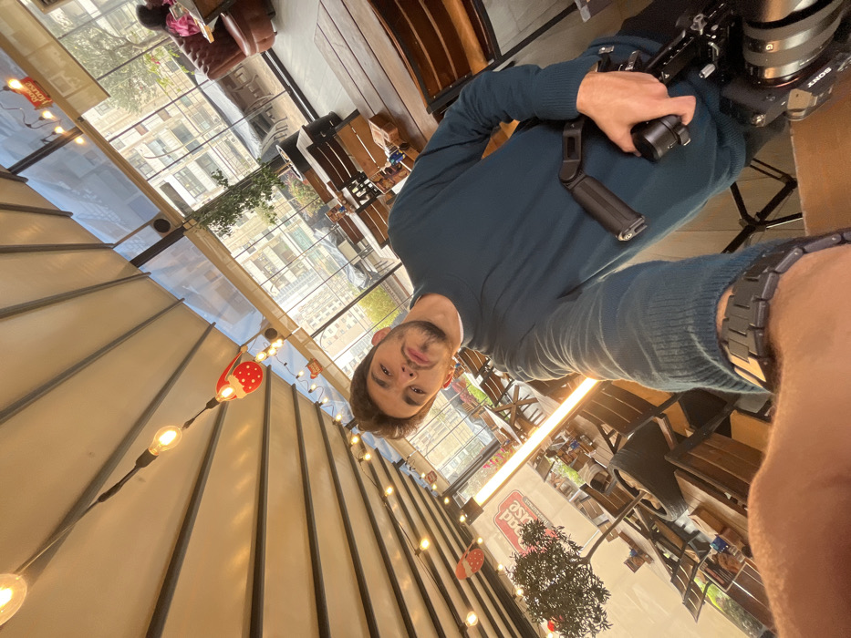The image depicts an indoor-outdoor cafe or restaurant section located in Kafr Sousa Municipality, Syria. A male individual, appearing to be in his mid-20s to early 30s with dark hair, beard, and mustache, occupies the foreground. He is wearing a dark teal long-sleeved sweater and a dark-colored watch on his left wrist. He is taking a selfie, extending his left arm toward the camera while holding a camera rig, identifiable as a Sony model with an attached black handle/grip, in his right hand. The environment features a retractable cream-colored awning ceiling adorned with string lights containing Edison-style bulbs and a red Santa hat decoration. A partial "Road House" sign is visible on the left wall. The space contains multiple wooden tables and benches, some with small wooden boxes on their surfaces. A large brown leather booth is situated in the background to the right. A small decorative tree with red ornaments stands on the left. A tall, vertical orange heating lamp is also present on the left side of the frame. Large glass windows offer a view of a dense urban area composed of multi-story buildings. One additional individual is partially visible sitting at a table in the far background to the right.