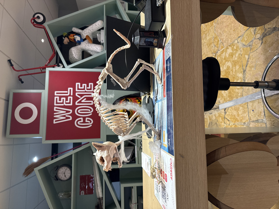 The image depicts an indoor scene within an Adagio Aparthotel, located in Serris, France, likely a reception or lobby area, decorated for Halloween. A light-colored wooden desk occupies the foreground. Centrally positioned on the desk is a plastic skeleton model of a cat, posed mid-stride with its mouth open, covered in artificial white cobwebs. To the right of the skeleton, a black Lenovo ThinkPad laptop is partially visible, alongside a small, black decorative lantern. To the left, several white pamphlets, one featuring a QR code and the "ADAGIO" logo, are spread out. Artificial cobwebs are scattered across the desk surface. Beneath the desk, a black adjustable stool with a chrome base rests on a mottled light brown and beige tiled floor. In the background, a mint-green, geometrically compartmentalized shelving unit is prominent. On its shelves, a brown broomstick with a pink handle leans on the upper left, an analog alarm clock and a glass bottle are on a mid-left shelf, and a red scooter is positioned on an upper right shelf. Below the scooter, a white abstract dog sculpture with a colorful figurine sitting on its back is visible. Above the shelving unit, a large red square sign with a white "O" is mounted, directly above a larger red rectangular sign displaying "WELCOME" in white capital letters. A dark, possibly Halloween-themed mask or decoration with orange and yellow features is partially visible behind the laptop. The ceiling is white with recessed lighting. No individuals are present in the image.