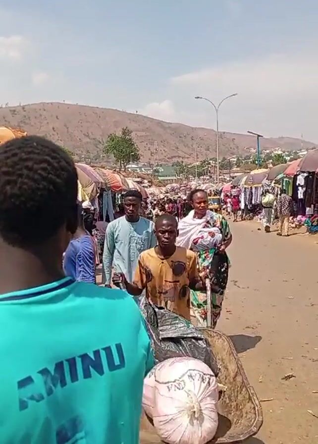 A person is filming in a busy outdoor market. The view is from behind a person wearing a bright green t-shirt with “R.MINU” printed on the back. In front of the camera, a man in a gold shirt is pushing a wheelbarrow down a slightly dirty road. The wheelbarrow contains a white sack and a black plastic bag. Behind him are several other people walking, including a man in a blue robe and a woman in a colorful dress. On both sides of the road are stalls with awnings. In the distance, a brown, grassy hill rises. The sky is blue and clear.