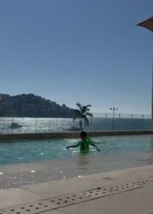 Two young children in bright green swimsuits are playing in a shallow pool on a sunny day. They are near the edge of the pool, which overlooks the ocean. In the distance, there is a landmass with buildings. A palm tree is visible near the edge of the pool. The sky is clear and blue. The pool deck is made of light-colored tiles. There are street lamps visible in the background.