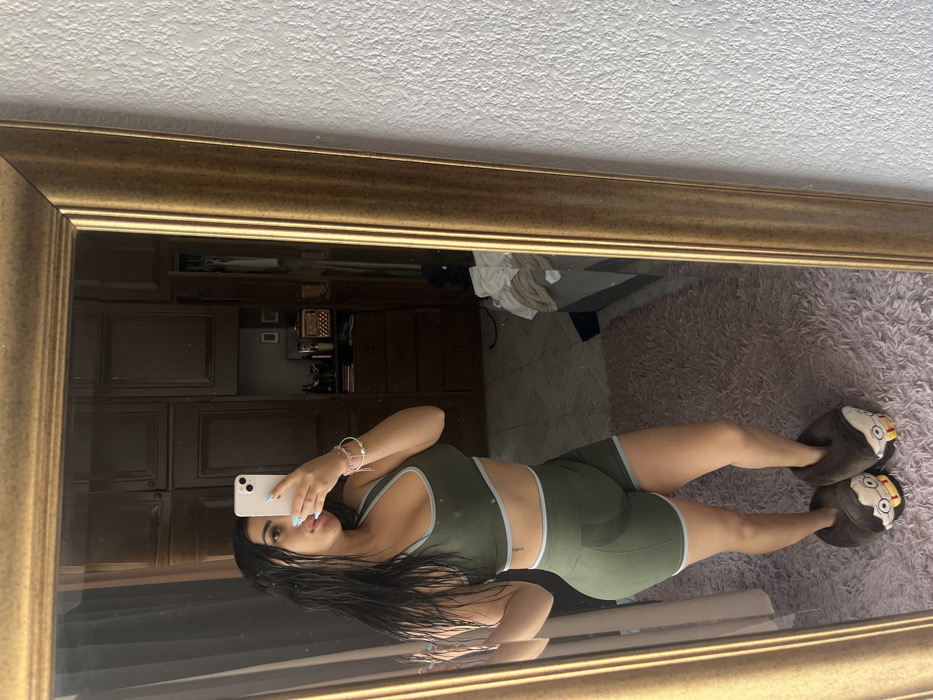 A young woman is reflected in a large, ornate mirror. She wears a matching green workout set and novelty slippers. Her hair is long, dark, and wet. She holds a smartphone to take the picture. The room contains closet doors and a light-colored carpet. There is also a mess of clothing visible. The mirror is in landscape orientation.