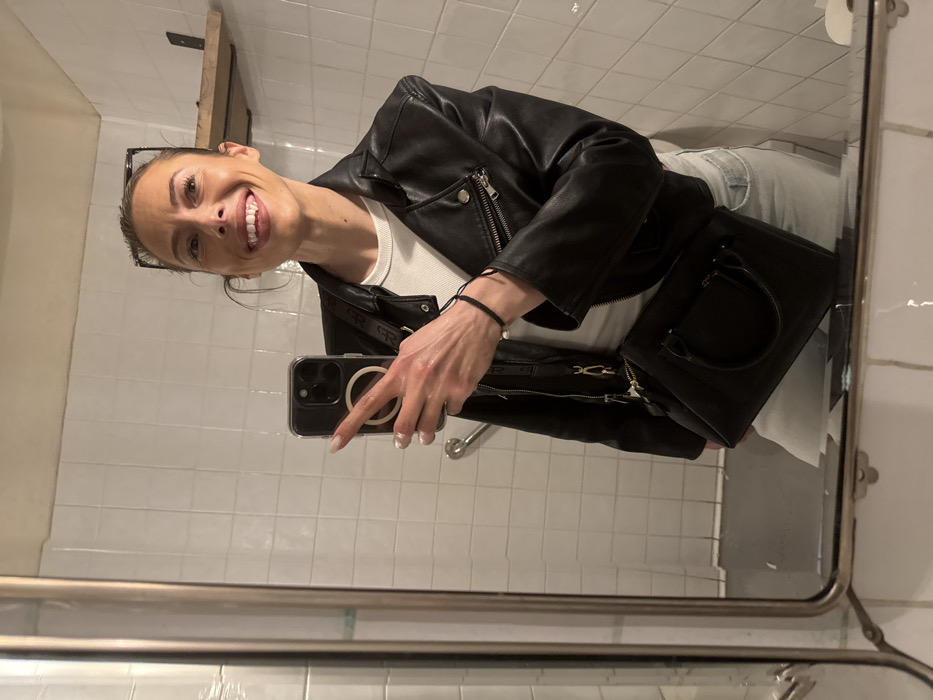 An adult female is depicted taking a mirror selfie inside what appears to be a public or semi-public restroom, consistent with environments found in establishments within Paris, France, though a specific location is not identifiable. The woman, with dark hair pulled back and eyeglasses resting on her head, is smiling broadly, revealing her teeth. She wears a black leather-style motorcycle jacket over a white ribbed short-sleeved top and light-colored jeans. A black cross-body bag with gold-colored hardware is slung over her left shoulder. On her left wrist, she wears a black string bracelet with a single white bead. Her left hand holds a dark-colored smartphone, featuring a MagSafe ring on its clear case, positioned to capture the reflection. The background consists of white square ceramic tiles with visible grout lines. A silver-toned grab bar or handrail is mounted on the left wall behind her. To her right, a small, rustic wooden shelf with black metal brackets is affixed to the tiled wall. The mirror itself has a simple metallic frame, reflecting part of a lower wall or floor structure, possibly a sink or toilet base, and what appears to be a chrome faucet handle.